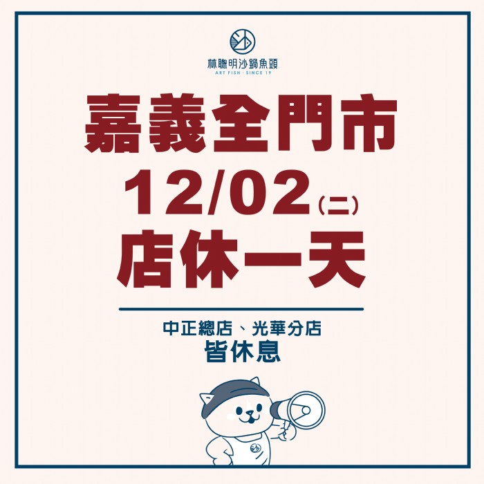 林聰明沙鍋魚頭嘉義全門市將於12/02(二