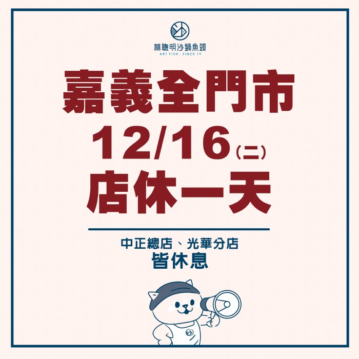 林聰明沙鍋魚頭嘉義全門市將於12/16(二