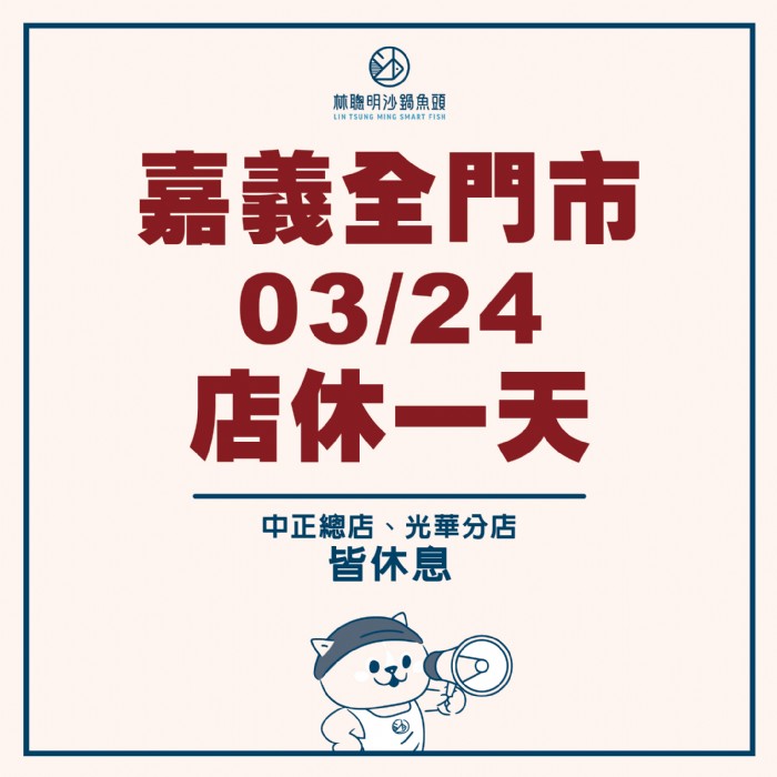 嘉義全門市(中正總店、光華分店)將於03/24(二)店休一天