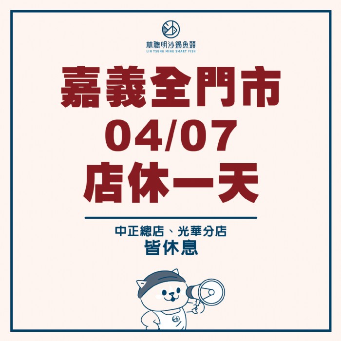 嘉義全門市(中正總店、光華分店)將於04/07(二)店休一天