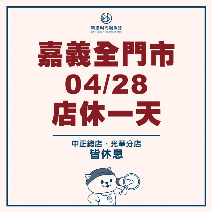 嘉義全門市(中正總店、光華分店)將於04/28(二)店休一天